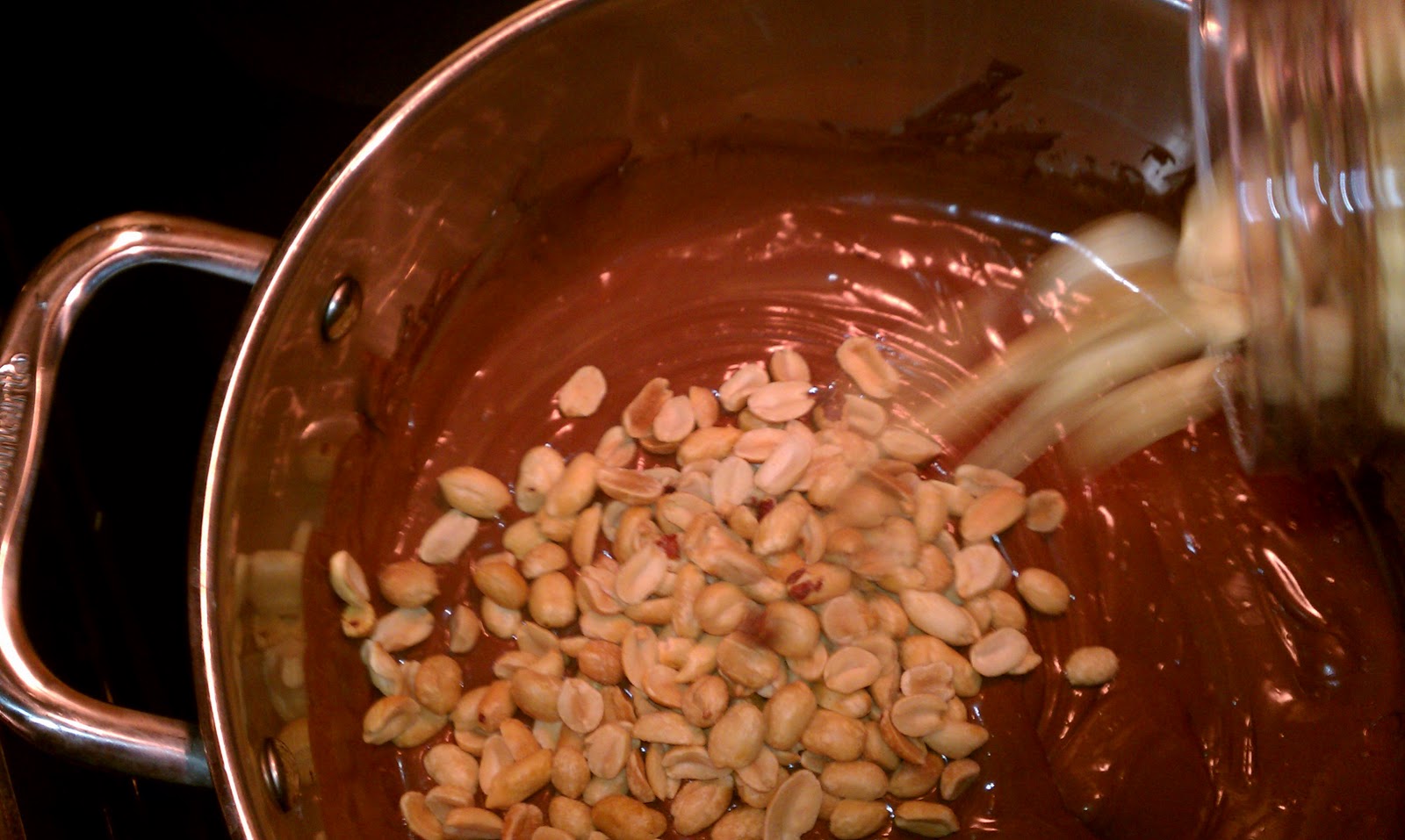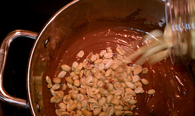 4.   Now its time to add your peanuts in. Pour the jars of peanuts in the chocolate.