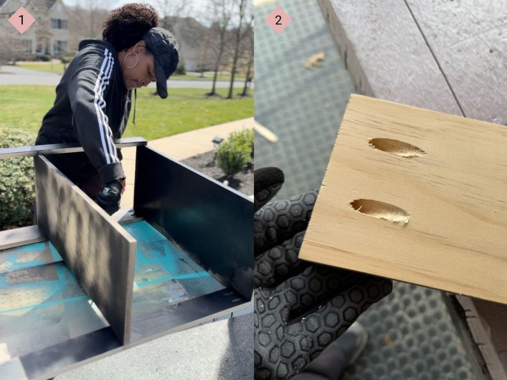 Step 3: Once the wood has been cut, you will want to add pocket holes to the ends of the two back pieces of wood so you can drill them into the side pieces easily (Image 2).